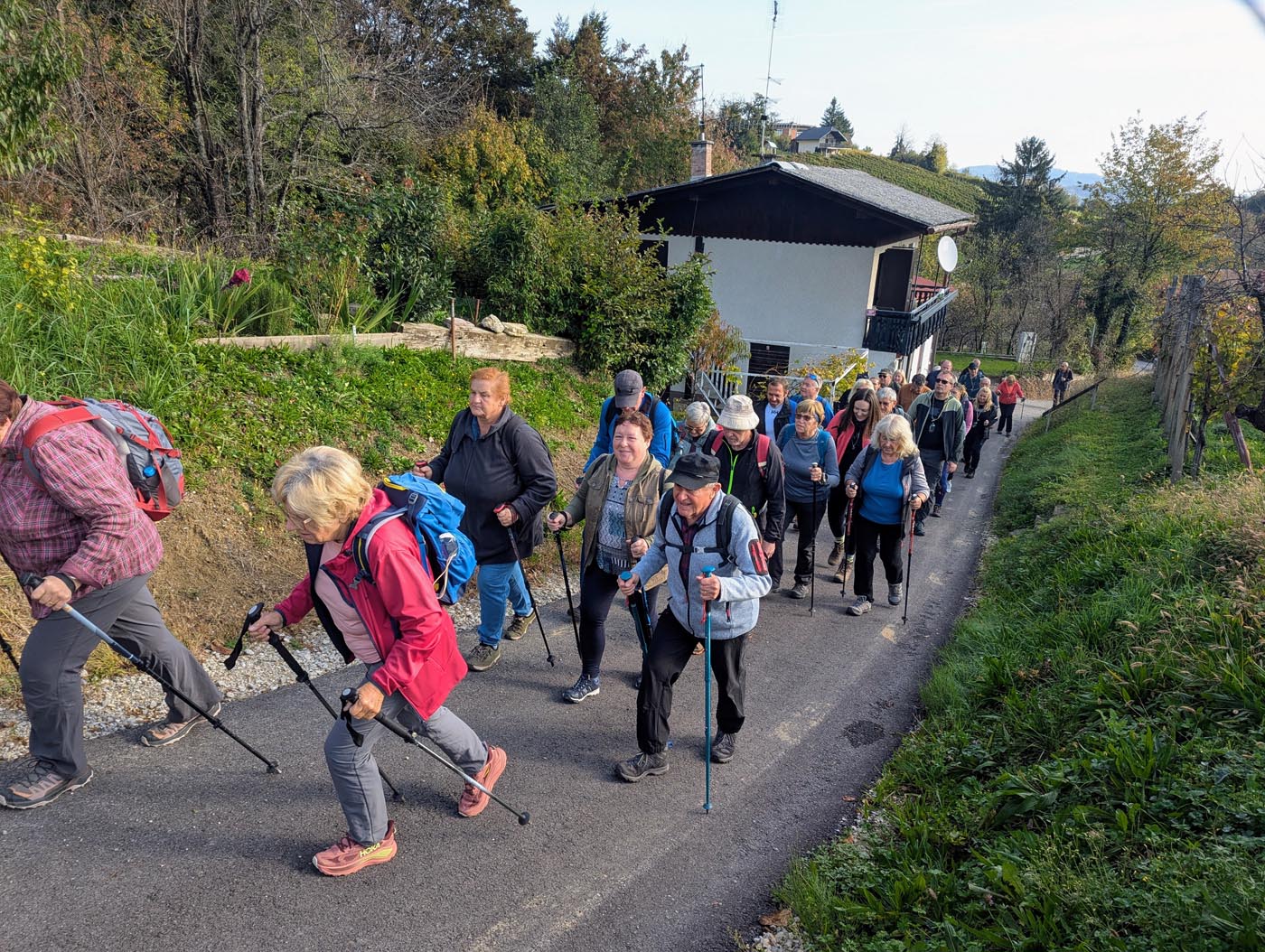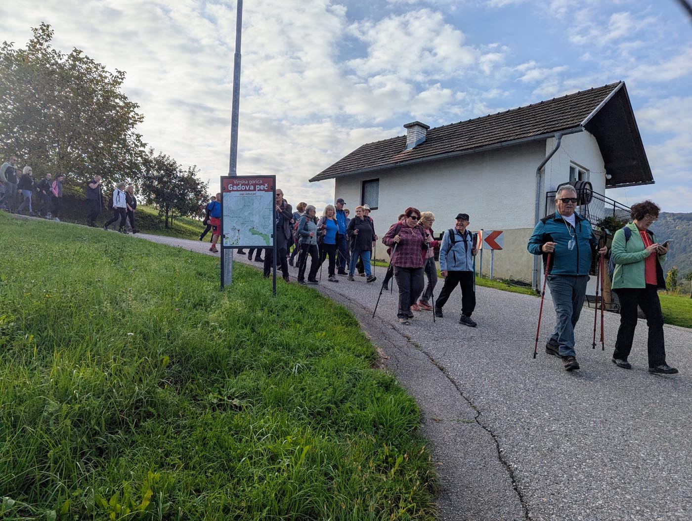 Pohod smo začeli na prireditvenem prostoru v Gadovi peči. Po kratki predstavitvi poti smo se odpravili skozi Jugovec v Razkrižje, kjer smo v prvem gadovem gnezdu obiskali Andrijaševe. Okusna jutranja malica nam je odlično teknila, ob zvokih harmonike pa smo tudi zapeli. Sledil je spust skozi Vrhovsko vas in mimo zanimivega muzeja starih kmetijskih pripomočkov v Belinje, kjer smo se najprej ustavili v zidanici Kuntarič. Ob ajdovem kolaču s skuto smo se osvežili z dobro domačo kapljico. Na koncu vinske lege Belinje smo se ustavili še v zidanico Kus, kjer so nam pripravili zelenjavno juho z mesom in suhomesnate dobrote. Po jutranjih meglicah so nas kmalu obsijali sončni žarki, ki so poskrbeli za čudovite razglede na pokrajino vse do Posavsko-Zasavskega hribovja. Vinogradi in gozdovi, ki so v tem času začeli spreminjati barvo listja, so pokrajino še dodatno lepšali.