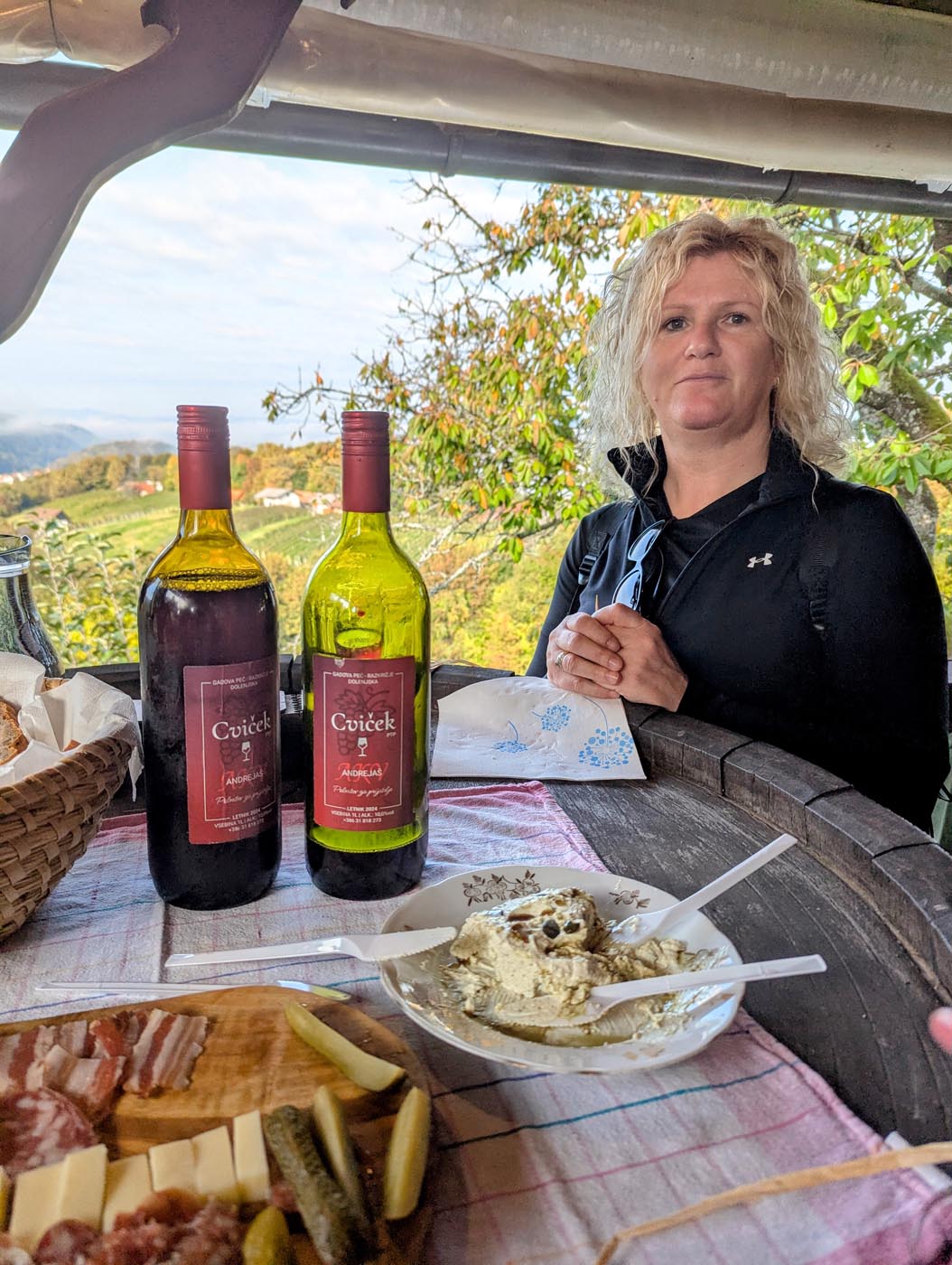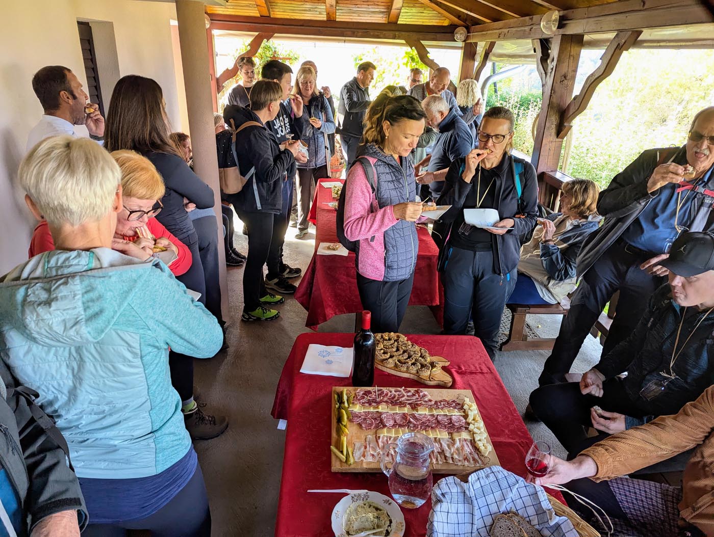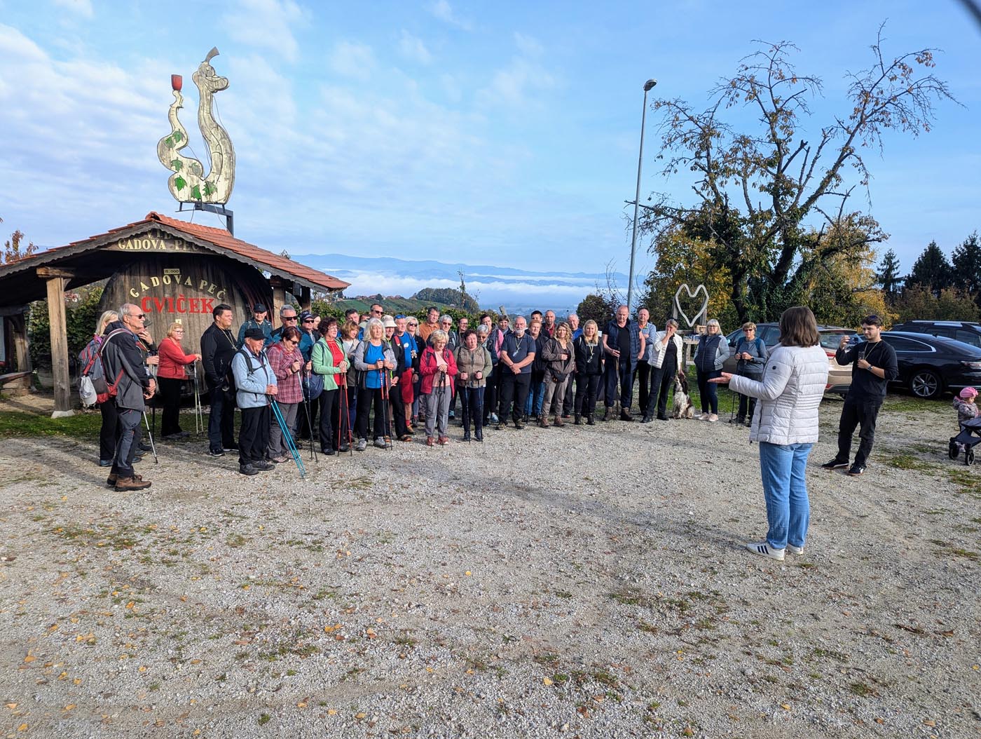 Pohod smo začeli na prireditvenem prostoru v Gadovi peči. Po kratki predstavitvi poti smo se odpravili skozi Jugovec v Razkrižje, kjer smo v prvem gadovem gnezdu obiskali Andrijaševe. Okusna jutranja malica nam je odlično teknila, ob zvokih harmonike pa smo tudi zapeli. Sledil je spust skozi Vrhovsko vas in mimo zanimivega muzeja starih kmetijskih pripomočkov v Belinje, kjer smo se najprej ustavili v zidanici Kuntarič. Ob ajdovem kolaču s skuto smo se osvežili z dobro domačo kapljico. Na koncu vinske lege Belinje smo se ustavili še v zidanico Kus, kjer so nam pripravili zelenjavno juho z mesom in suhomesnate dobrote. Po jutranjih meglicah so nas kmalu obsijali sončni žarki, ki so poskrbeli za čudovite razglede na pokrajino vse do Posavsko-Zasavskega hribovja. Vinogradi in gozdovi, ki so v tem času začeli spreminjati barvo listja, so pokrajino še dodatno lepšali.